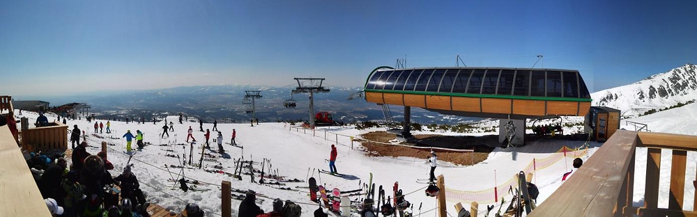 Wracając do opisu dnia, to po trzech godzinach udaliśmy się na kawę i posiłek do baru/restauracji przy górnej stacji. Termometry w słońcu wskazywały aż 20 stopni, w cieniu natomiast słupek rtęci sięgał 10, co w połączeniu z bezchmurnym niebem przypominało bardziej weekend majowy niż początek drugiego tygodnia kwietnia. Oferta Apres Ski w Strbskim Plesie jest na wysokim poziomie – w obrębie restauracji znajdowało się wiele ławeczek oraz puf, z których można było podziwiać piękną dolinę Popradu i wyrastające w oddali Niskie Tatry.
